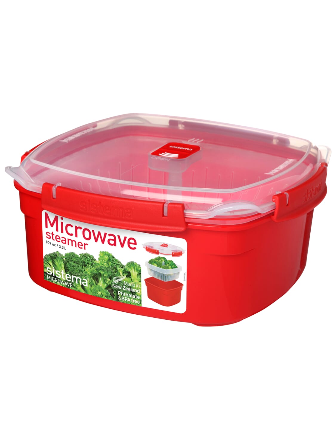 Microwave™ Microwave solutionsThe Sistema® Microwave™ Steamer has been specifically designed for steaming vegetables, fish and poultry. Just add water to the base, add your ingredients to the steaming basket and close the distinctive Sistema® easy-locking clips. Open the steam vent, and cook or reheat. Steam release vent in the lid for splatter-free heating. Removable steamer basket. Convenient easy-lift tabs make it simple to transport from microwave to bench.9.4in X 4.1in X 9.4in -