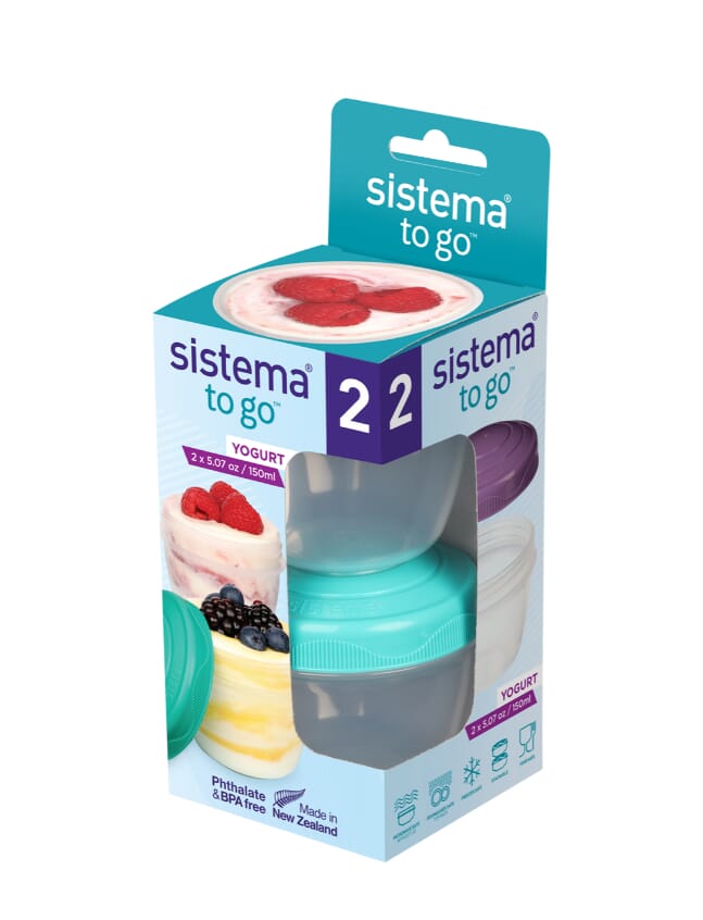 TO GO™ For people on the goThe Sistema® Yogurt TO GO™ is perfect for taking your yogurt, snacks, fruit and more on the go. Set of 2. 150 mL capacity each. Domed seal-tight screw-top lids keep your snacks fresh until ready to eat. Stack for compact storage.2.9in X 7.0in X 2.9in -