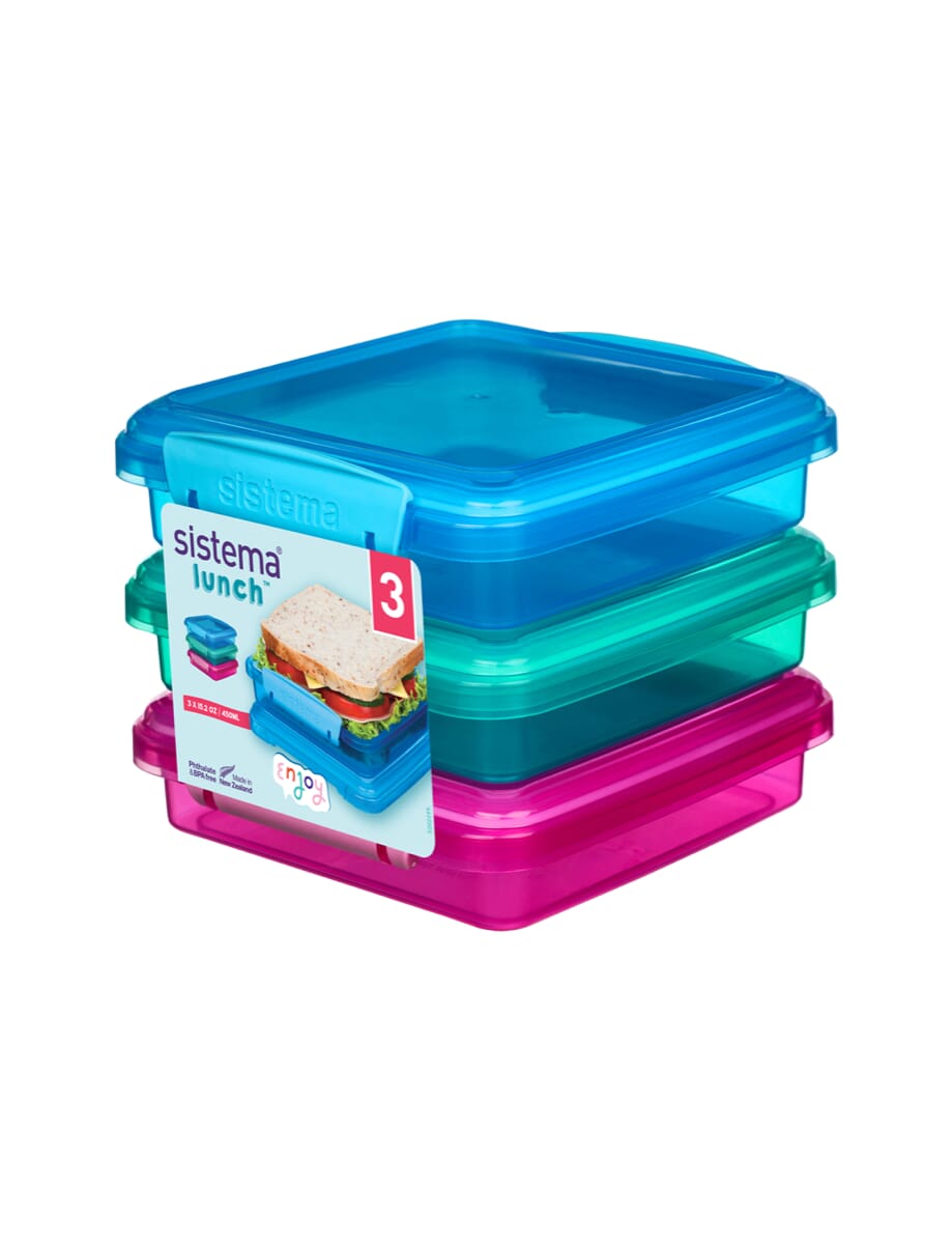 Lunch™ Colourful lunch storageThe Sistema® Lunch™ Sandwich Box 3 Pack is perfect for transporting your lunch and snacks to work, school or the park while helping to cut down on using plastic bags, cling film and foil. Modular stacking shape ensures the most efficient use of space in the pantry, fridge and freezer. Sistema® easy-locking clips plus flexible seal keeps food fresher for longer.5.7in X 4.9in X 5.9in -